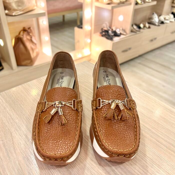 Mocasín Borlas Miel Textura Reptil En Cuero