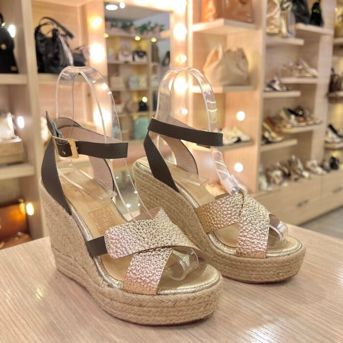 Inicio CALZADO Plataforma Yute 7½ Dorada con Verde Oliva En Cuero